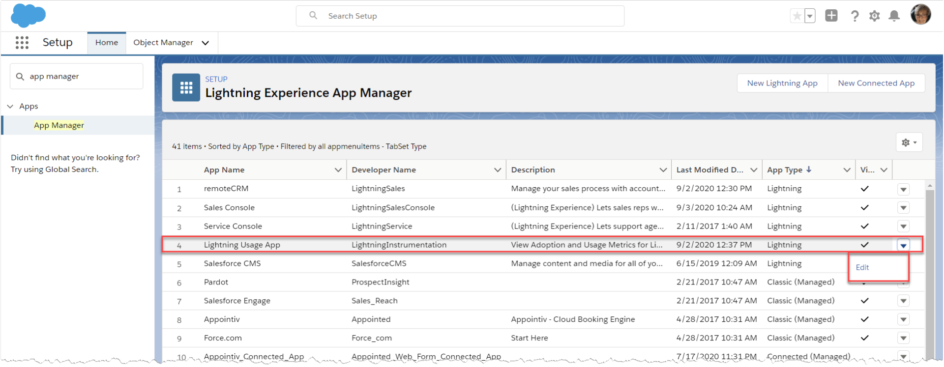 7. Finally, you will need to Add a Forecast Tab for your sales users and sales managers to view. From setup use the quick find box and enter App Manager. Click to edit on your Lightning Usage App.
