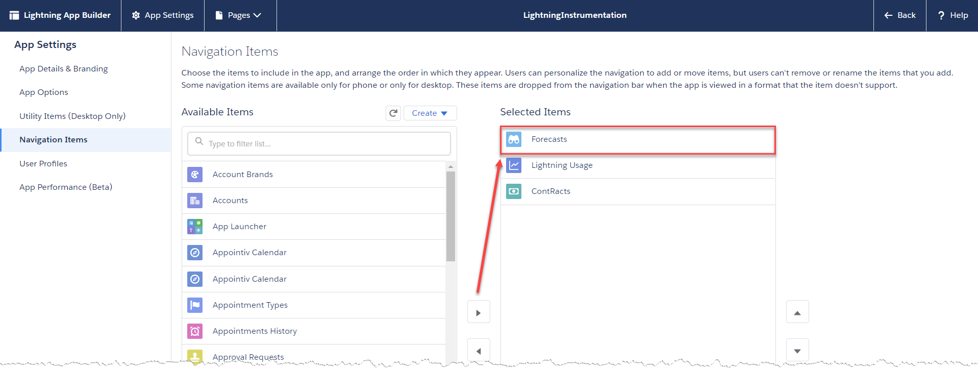 8. Under App Setting select Navigation Items and find Forecasts. Add to the Selected Items for the tab to show under the Sales Console.