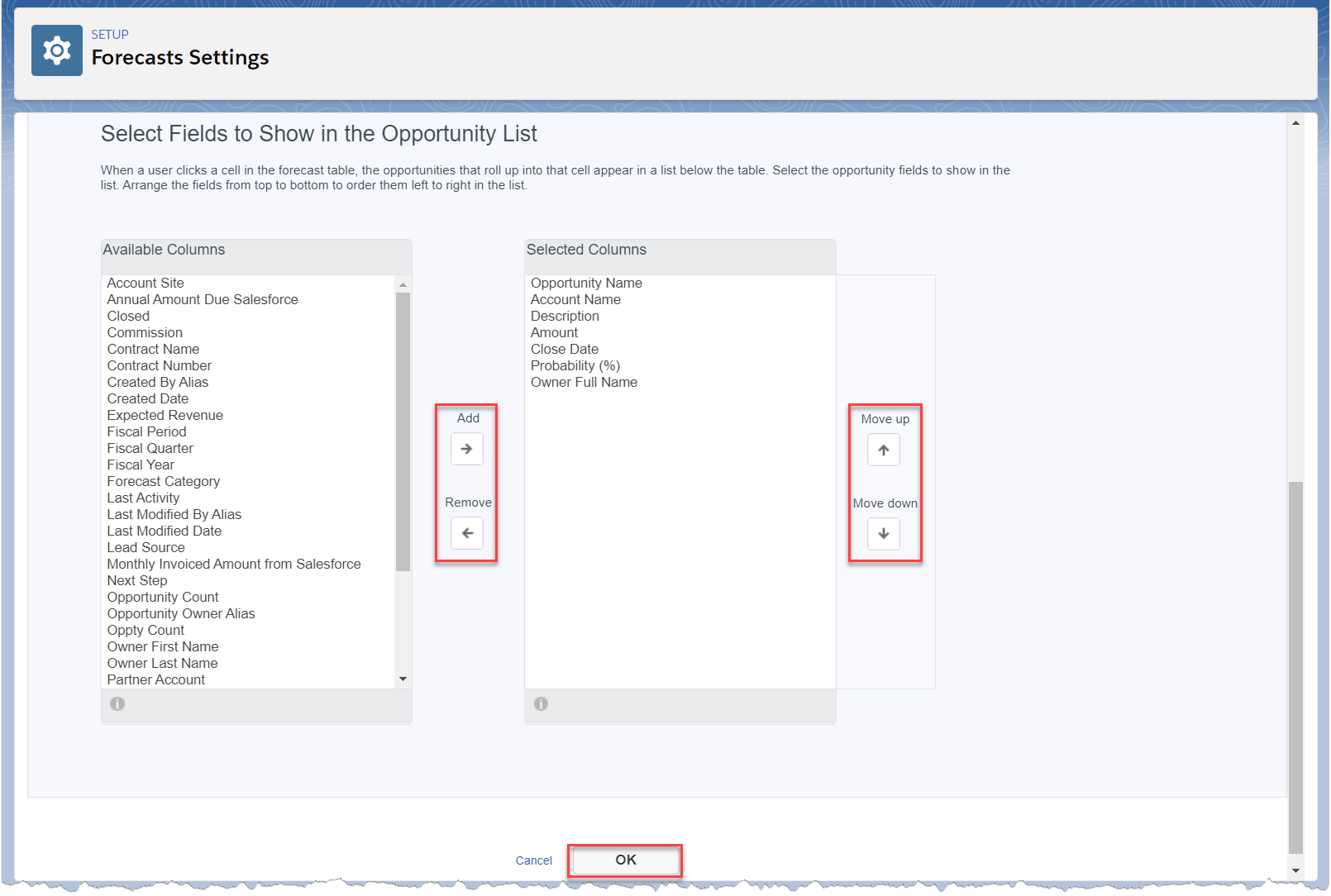 3. Scroll down the page to Select Fields to Show in the Opportunity List and make your selection by adding, removing, moving up, or down your selected columns. Click OK.