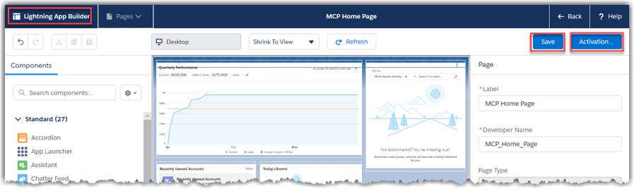 To activate your Home page, first Save and then click on Activation. A screen will pop-up notifying you that Home pages can be assigned at different levels: the org default, the app default, or any app and profile.