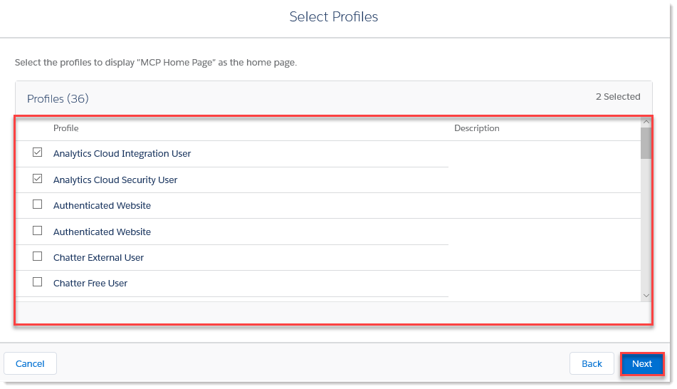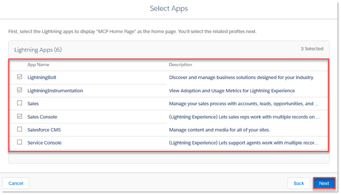 In this example, we are going to set this Home page for different user profiles. It will override all other home page assignments. Select Assign to Apps and Profiles, and next select your Lightning Apps. Click Next.