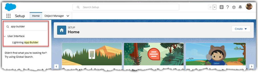 First, you need to access the Home page on the Lightning App. Just navigate to Setup, enter Lightning App Builder in the Quick Find box, and then select Lightning App Builder.