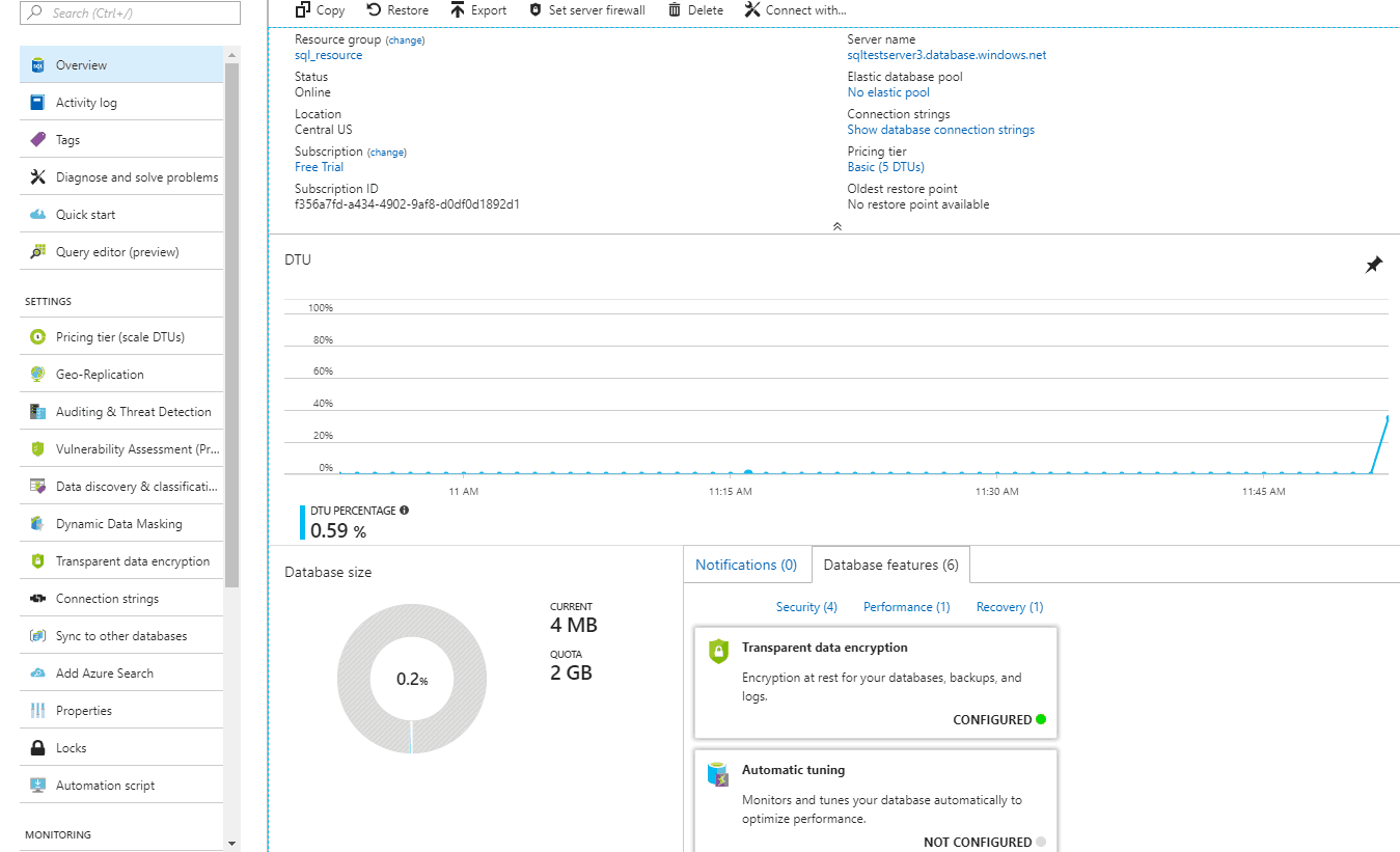 6. The new database will show up in the main screen once Azure has completed provisioning it. Use the bell icon at the top right of the portal screen to see active notifications. This will include the status of the creation of the database.