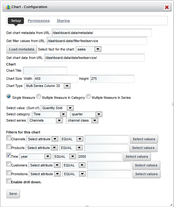 Towards the bottom of the configuration screen there are several filters defined. These filters are automatically configured based on the dimensions in your data model. Say you want to only see data for the year 2000. Find the filter marked Time, select the Year attribute from the dropdown, and click the button marked Select Values. Select the year 2000 and the popup box closes, then click Save on the configuration screen. You now are displaying data just for the year 2000.