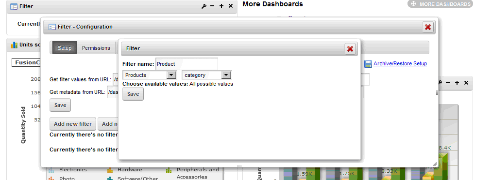 For example, let’s create a filter to select product categories. First, if you don’t have a Filter portlet on your page, drag a Filter onto the page. Next, locate the portlet configuration screen as you did with the Chart portlets (find the wrench icon for Options and then select Configuration). Click on the button marked Add New Filter, give the filter a name like Product or Product Category, select the Products dimension and Category attribute from the dropdowns, and click Save.