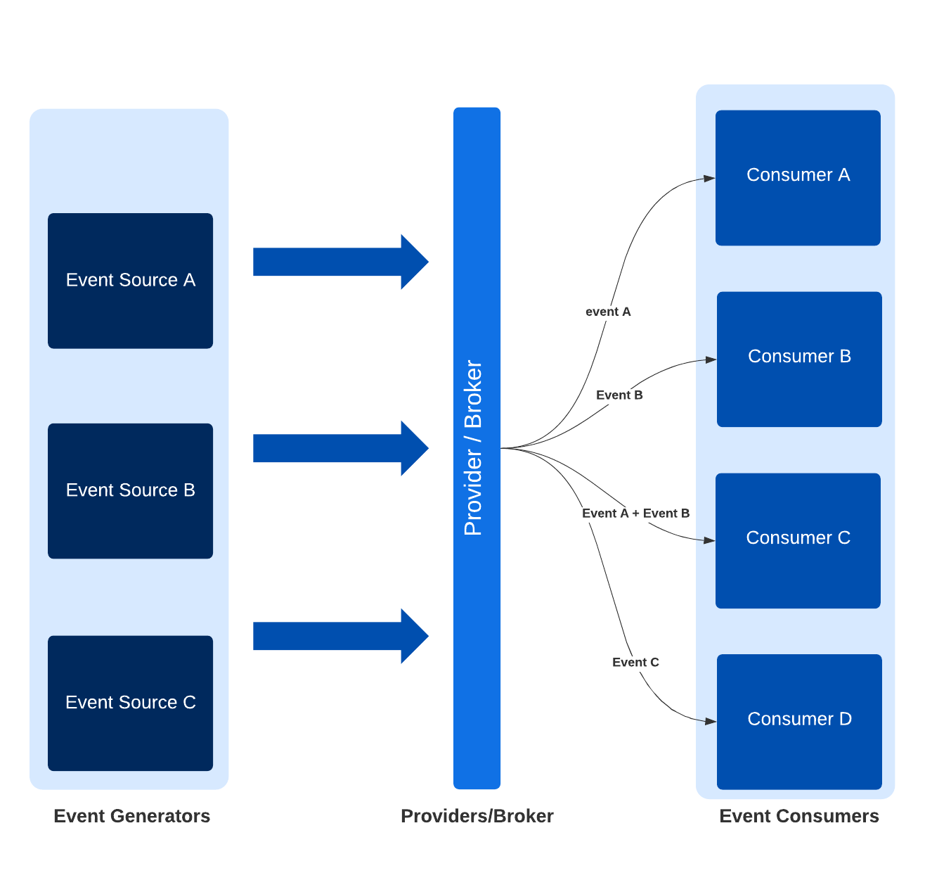 - Event Provider: receives the events from the publisher and distributes them to one or more consumers based on the type of channel the event is sent to. It is also responsible for storing events for reliability.