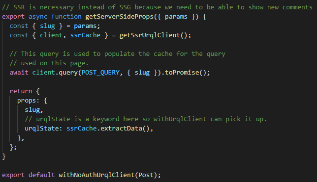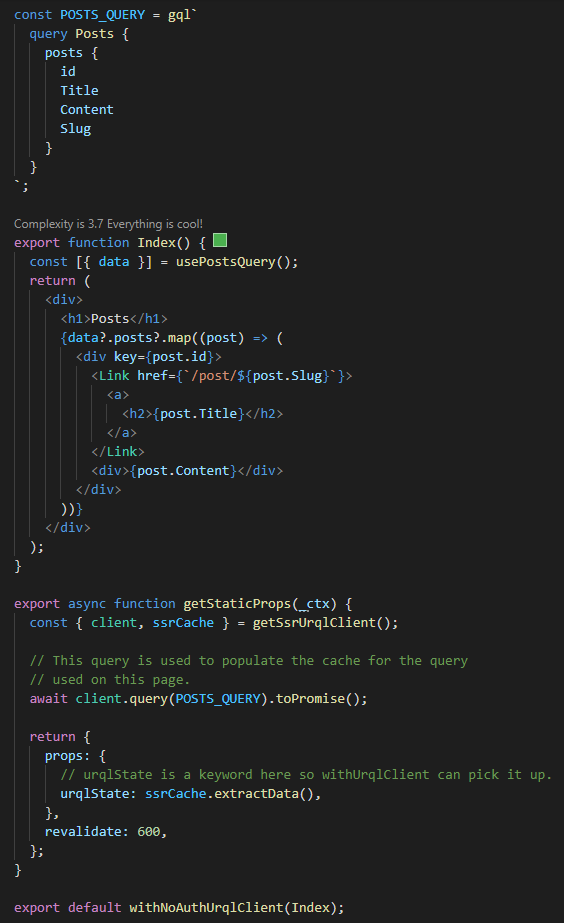 Note that usePostsQuery is codegen’d from the POST_QUERY string. Note also the withNoAuthUrqlClient HOC. The query, run at build time, will not have the Authorization token set. This component’s HTML is then generated on the server-side at build time (SSG).