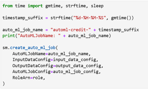 Create an Autopilot job and start it. The job creates models and terminates after completion. Given below is the code for creating an Autopilot job.