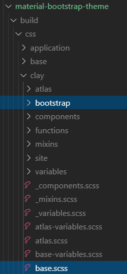 First, we need to understand how Bootstrap is integrated into the theme. It’s located in the build/css/clay directory, which also contains base.scss, which we will need to change later.
