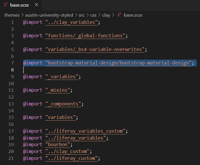 However, there is still a key technical challenge. The SCSS (Sass) of Bootstrap Material Design files aren’t supposed to layer on top of the SCSS files of Bootstrap, they are supposed to completely replace them. If you understand the architecture of Liferay themes, you can see why this would pose a problem– Liferay’s Clay does not make swapping out Bootstrap SCSS files trivially easy, but it’s possible. So let’s dig in…