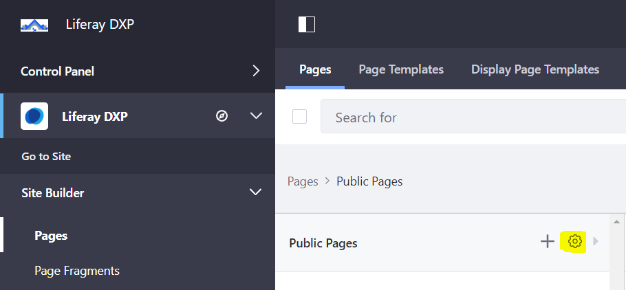 Then, sign in to your Liferay instance. Go to Pages, Public Pages, and click the gear icon: