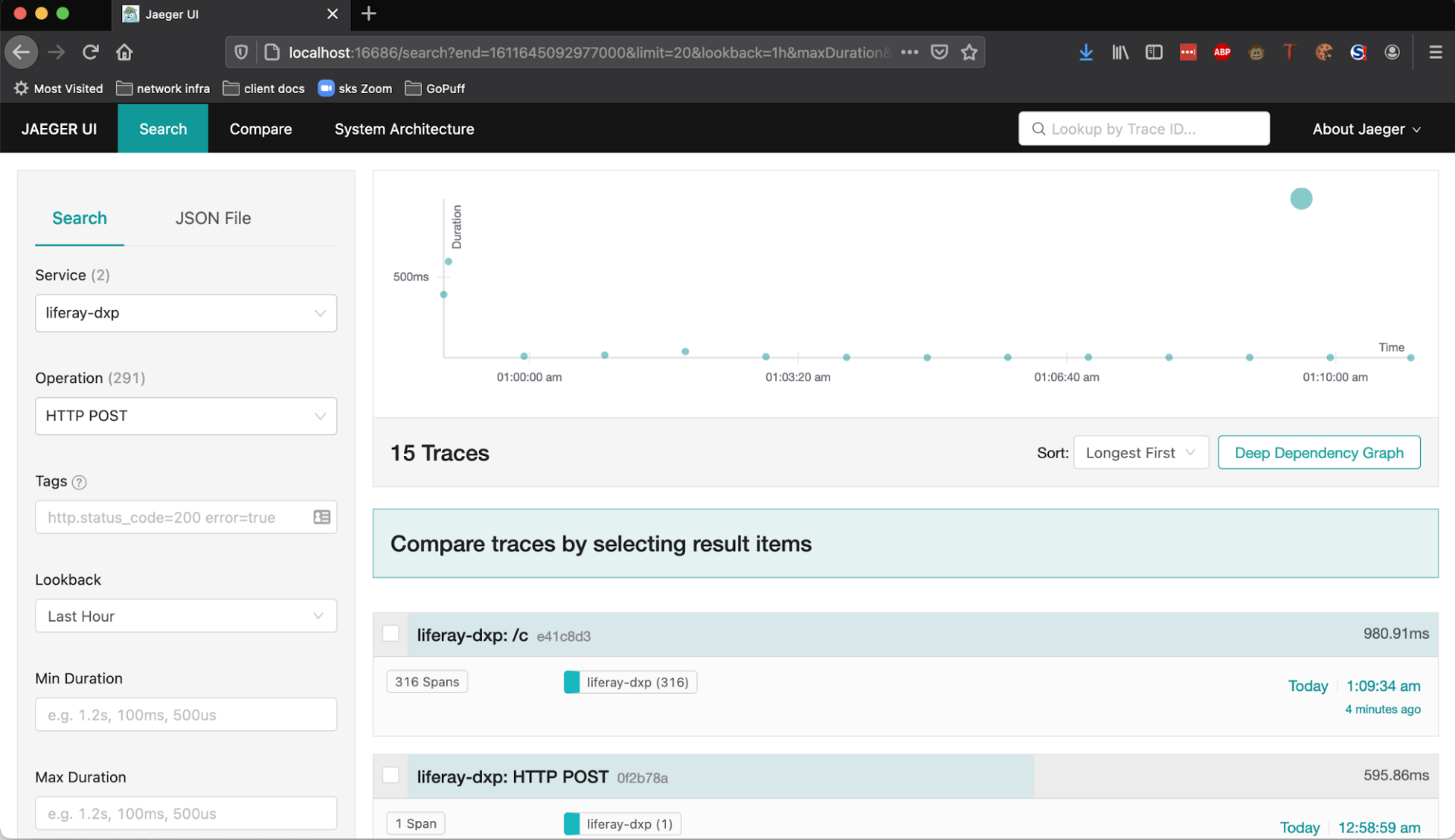 Once both the Jaeger and Liferay containers have initialized, you should start seeing trace data from your Liferay instance appear in your Jaeger UI. This example POC tags all Liferay data with the liferay-dxp service name in Jaeger. In the Jaeger UI, you’ll see the Service dropdown populated with that service name and be able to query the trace data coming in.