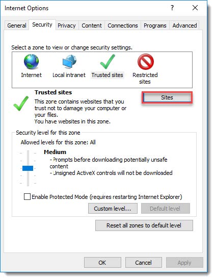 - Make sure the site is in the Trusted Sites in Internet Explorer.