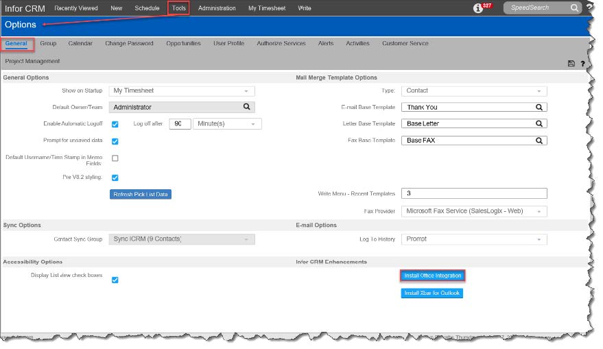 It’s important to know that this functionality is unrelated to the Xbar. The Write menu is actually added by a separate add on called the Office Integration. This is available for download by clicking on the Infor CRM Tools menu |General Tab| Install Office Integration button. Often this is already installed, but due to issues like security changes and updates, the Write menu no longer appears. Here are some quick things to check to bring back the functionality of the Write menu: