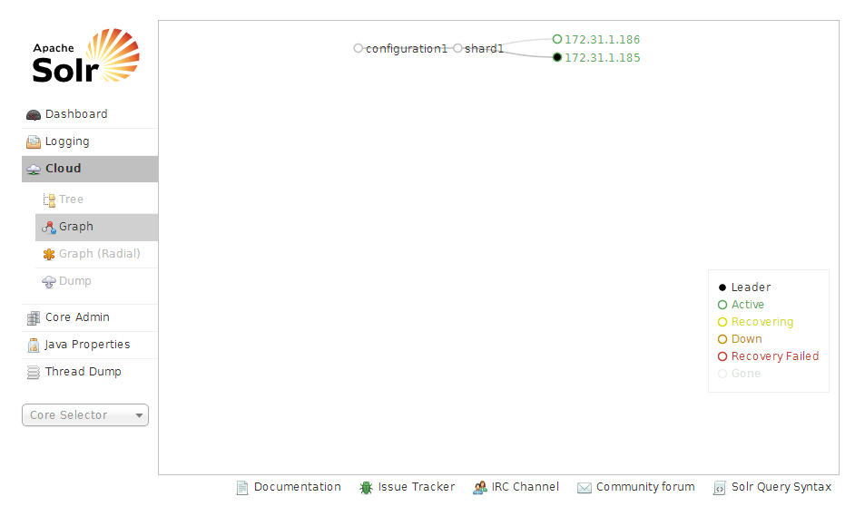 Once the Solr instances are up and running, access the admin console by hitting http://${TOMCAT_IP_ADDRESS}:${TOMCAT_PORT}/solr and click on “Cloud” in the left navigation; you will be presented with a screen that looks similar to the following: