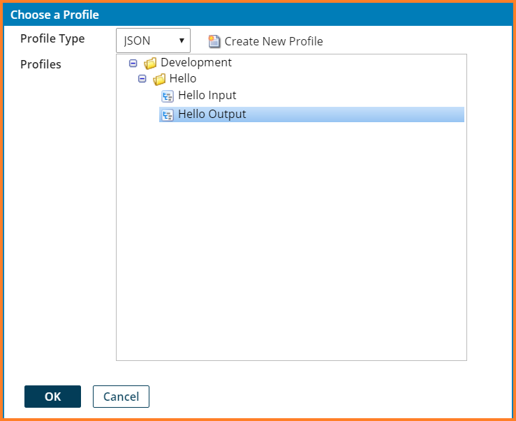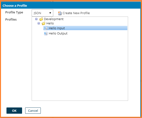 14. Choose a Profile dialog window appears. Select the profile type as JSON.Hello folder gets displayed in the Profiles display. Expand the Hello folder and select Hello Input profile. Click Ok.