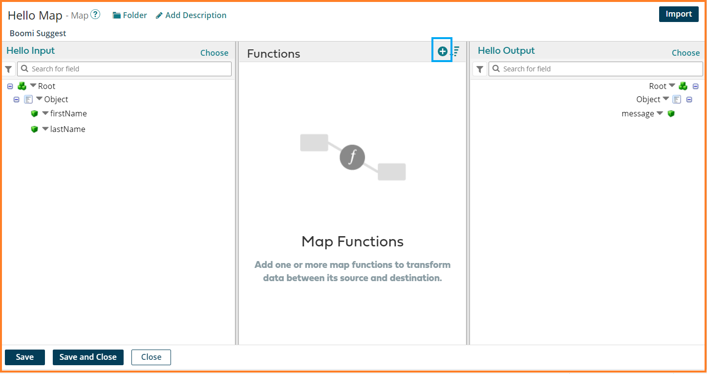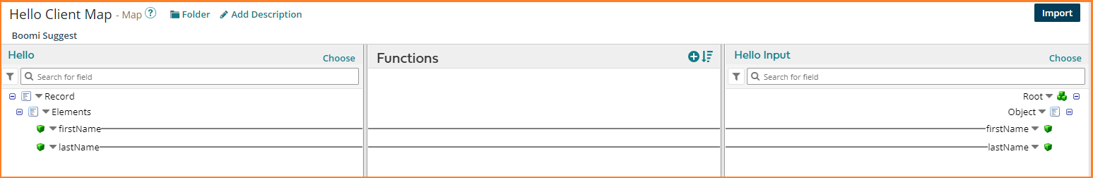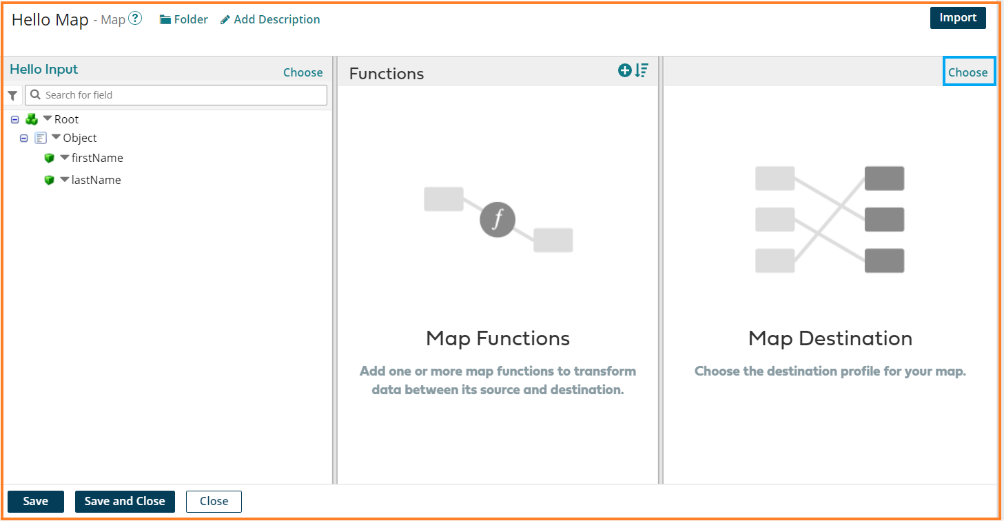 6. Map the fields firstName and lastName of Hello Flat File source profile to the firstName and lastName of the Hello Input JSON destination profile. Click Save and Close.