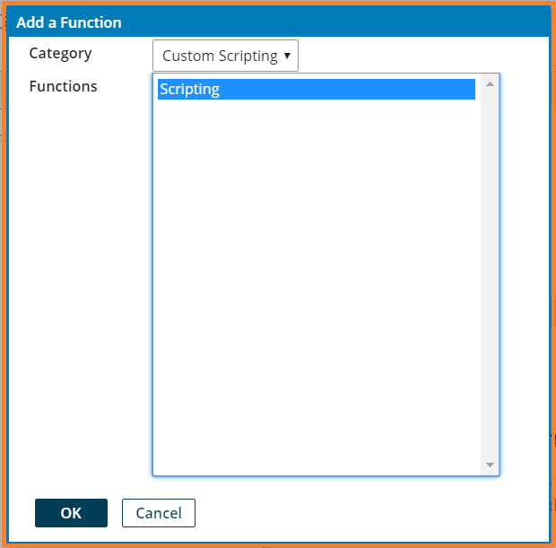 18. Add a function dialog window appears. Click on the Category dropdown and select Custom Scripting. Select Functions – Scripting. Click Ok.