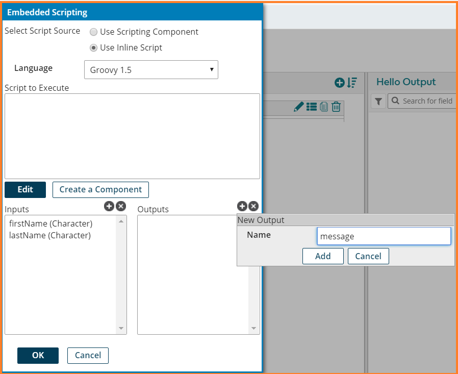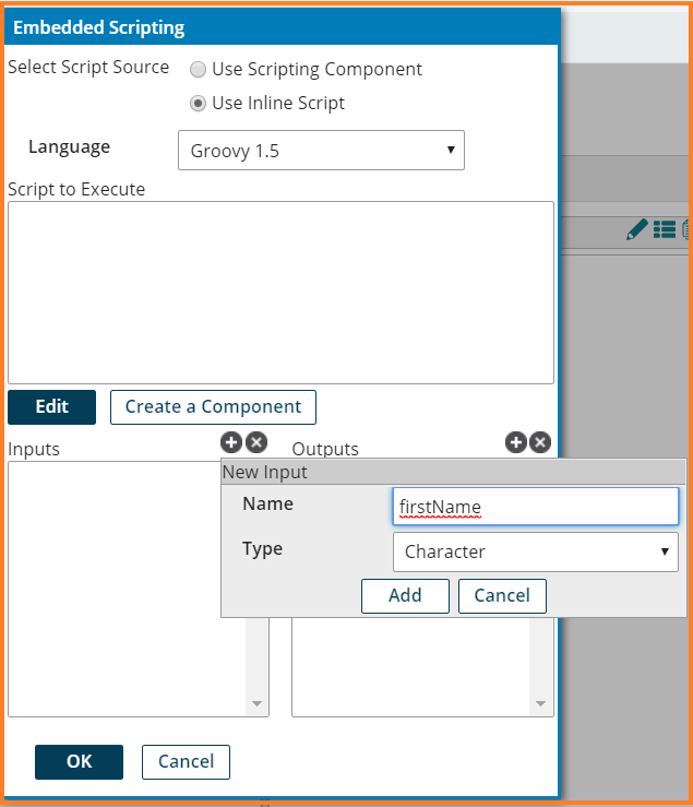 20. A New Input dialog appears. Enter Name – firstName and Type – Character. Click Add. Repeat the same to add lastName. Click Ok.