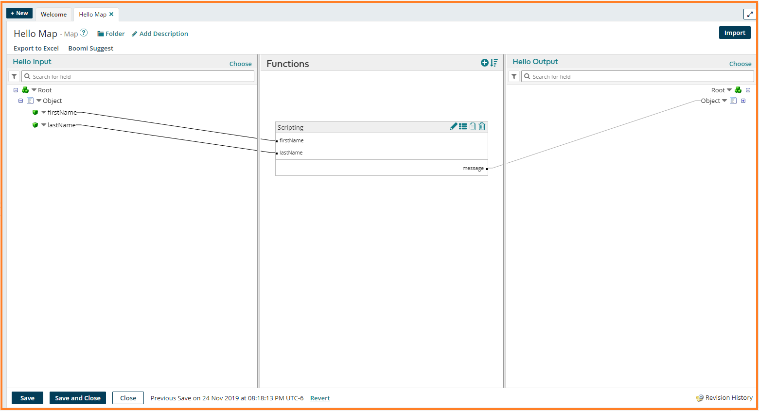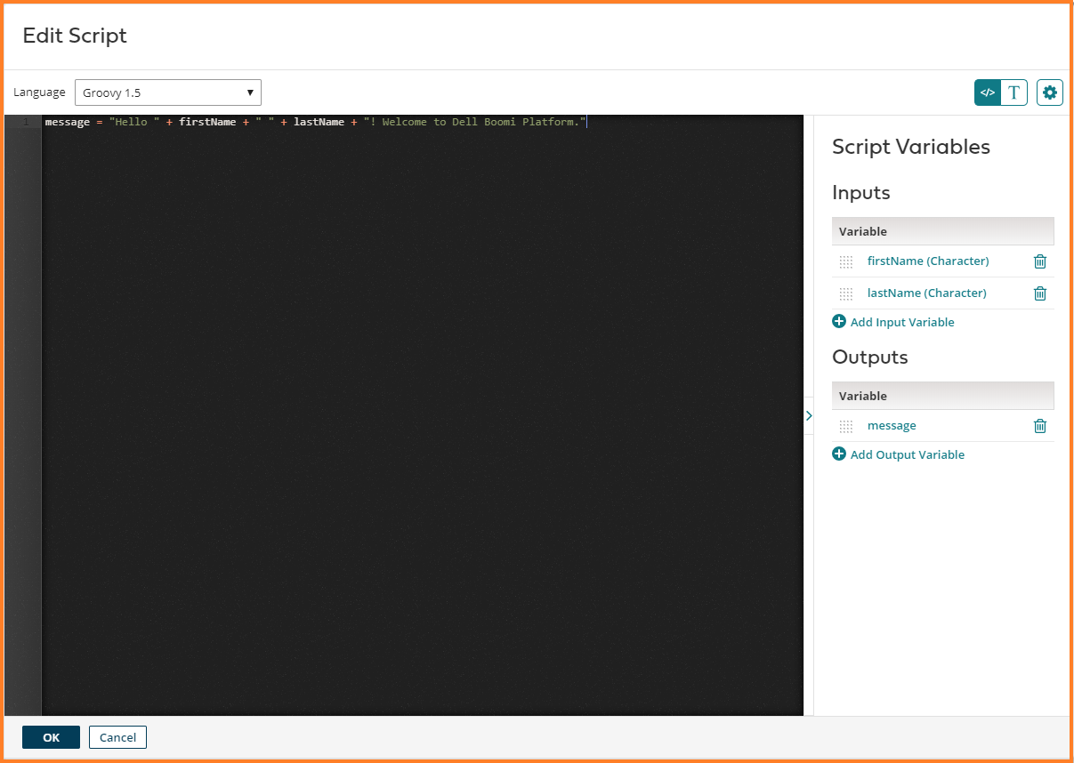 message = “Hello ” + firstName + ” ” + lastName + “! Welcome to Dell Boomi Platform.”