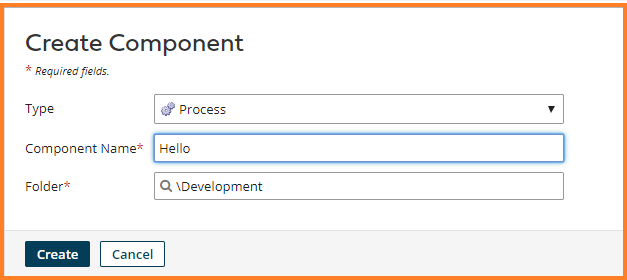 to create a Hello process component. A Create Component dialog appears. Select Type – Process. Component Name – Hello. Click Create.