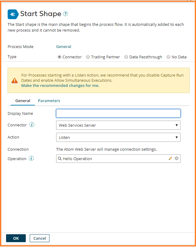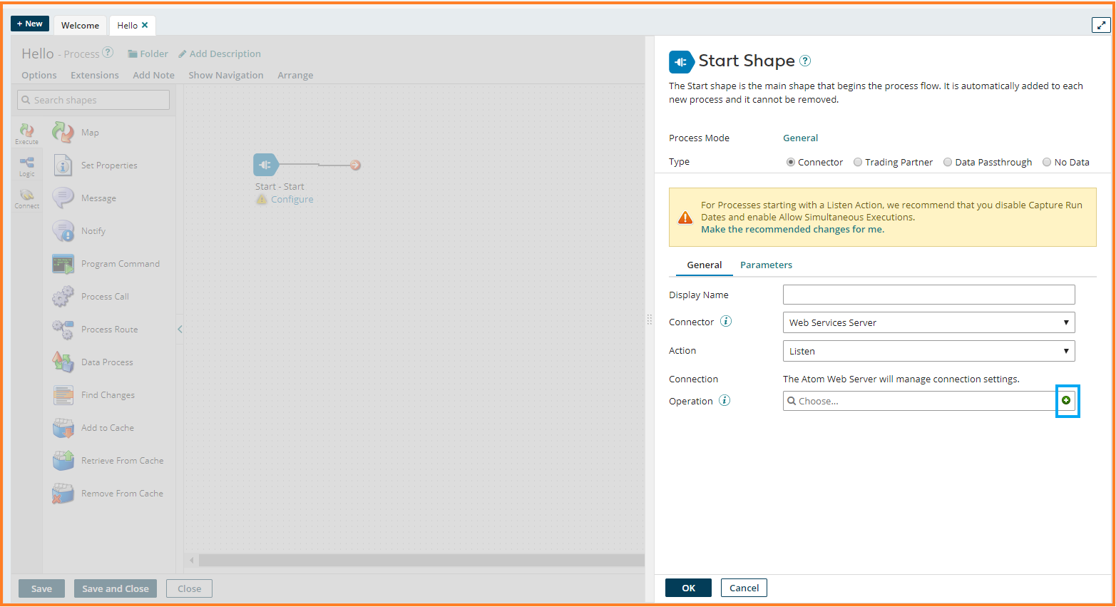 29. The operation name – Hello Operation gets filled in the Operation field in the Start Shape. Click Ok.