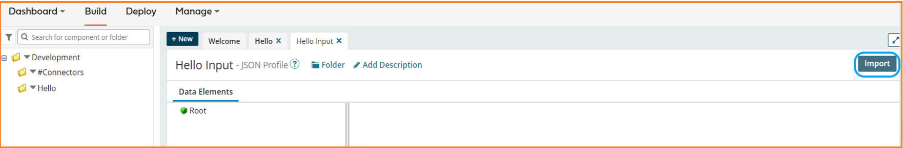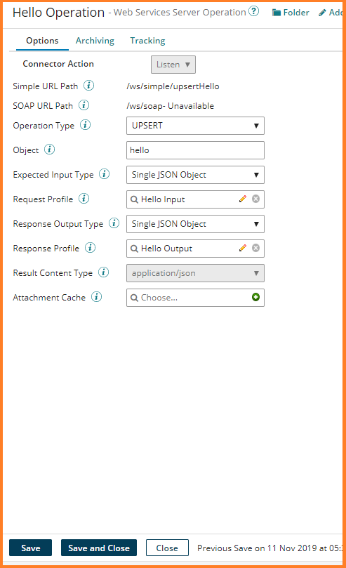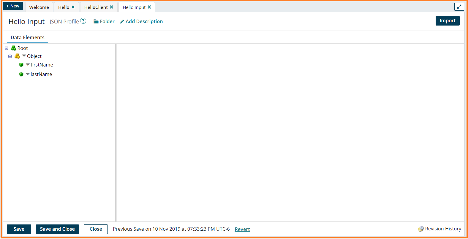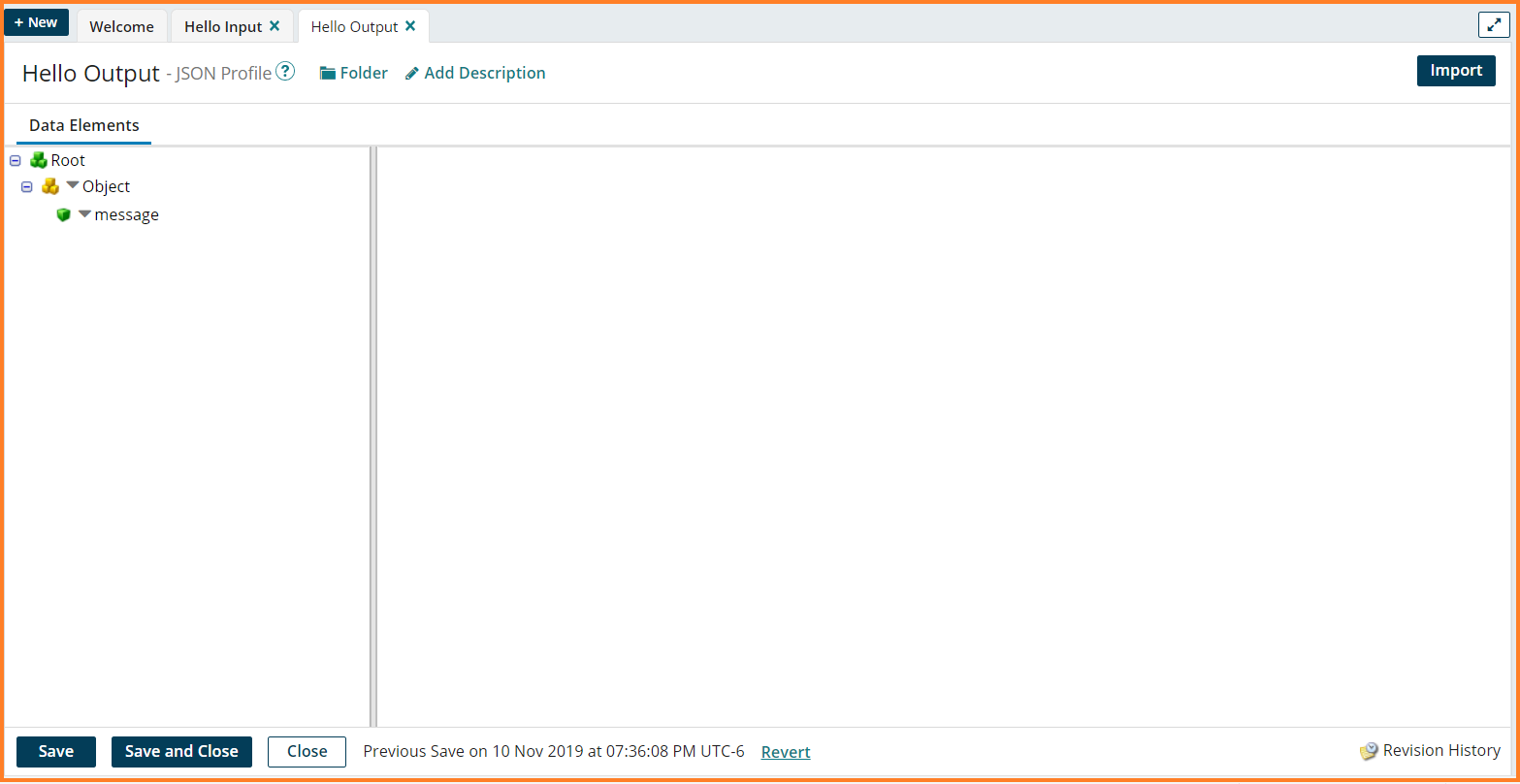 9. The Hello Input JSON Profile will be loaded. Click Save and Close