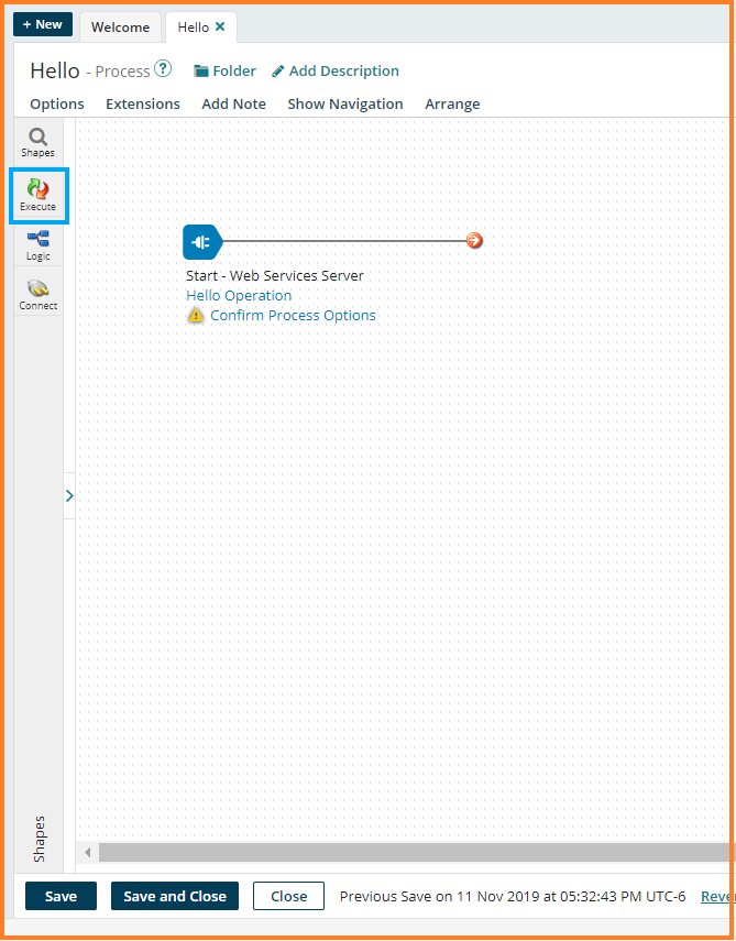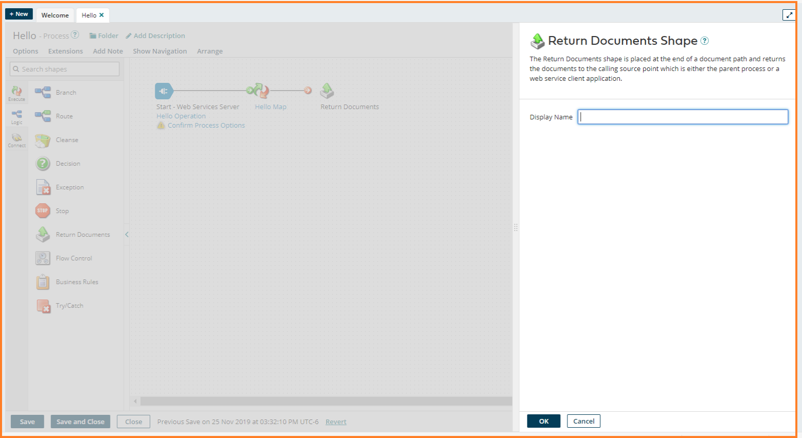 to view the Logic shapes. Drag the Return Documents shape onto the canvas next to the Map shape. Click Ok. Connect Hello Map Shape to the Return Documents Shape. Click Save and Close.