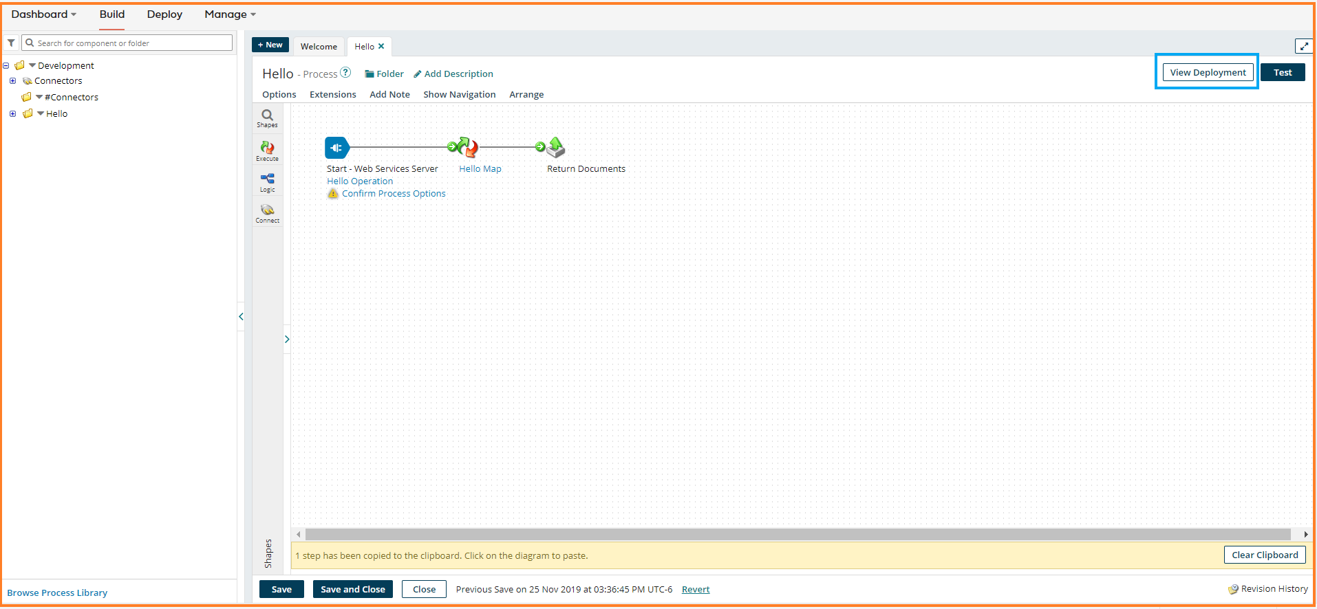 36. Connect Hello Map Shape to the Return Documents Shape. Click Save and Close.