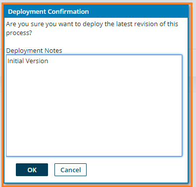 7. A Deployment Confirmation dialog box appears. Enter Initial Version in the Deployment Notes text area and click OK. The service gets deployed to the Local Atom.