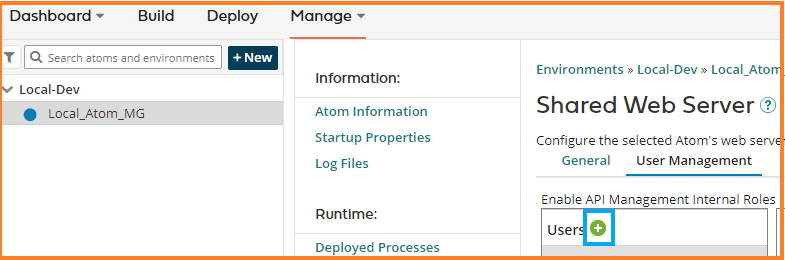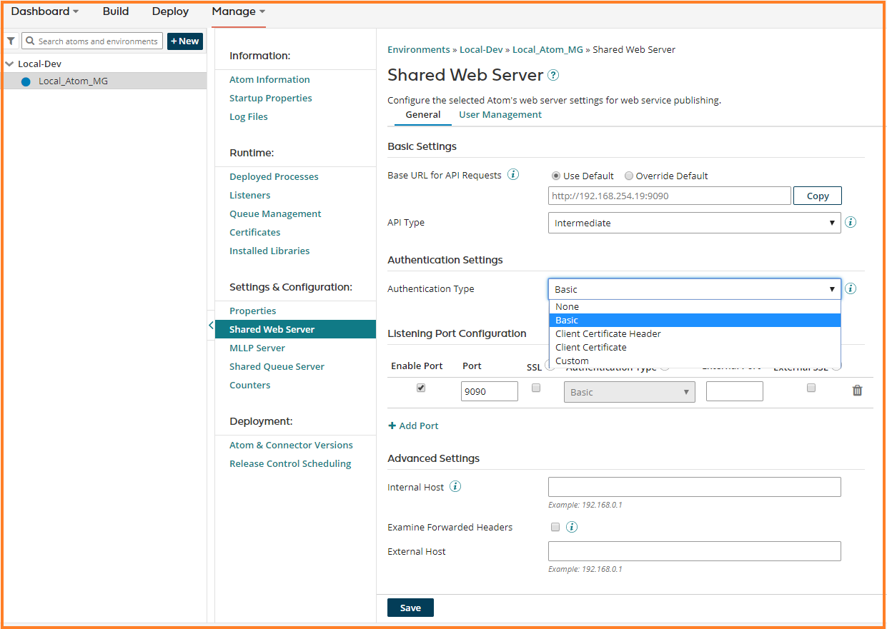 1. Navigate to Manage -> Atom Management -> Local_Atom_MG. Click on Shared Web Server under Settings and Configuration. Select Basic for Authentication Type under Authentication settings. Copy the Base URL to a text editor to be used later in the Http Client connector call.