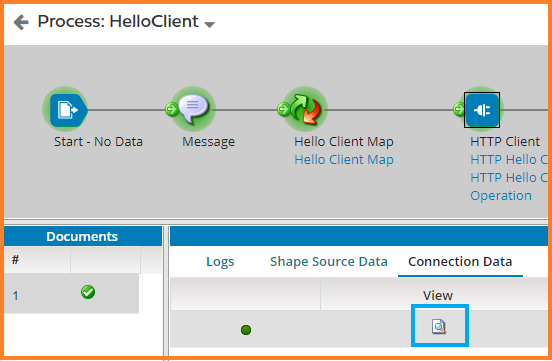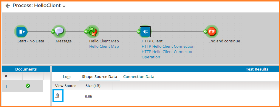 3. Click on the Http Client Shape once the test is completed. Click on the View Source under Shape Source Data.