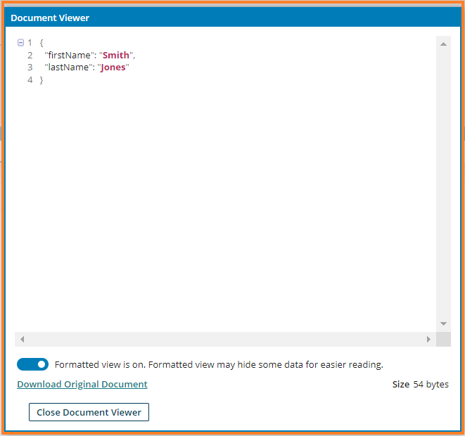 4. A document viewer opens up showing the JSON request that was sent to the Hello Service. Verify the test data and click Close Document Viewer.