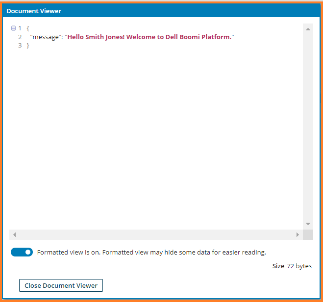 "message" : "Hello Smith Jones! Welcome to the Dell Boomi Platform."