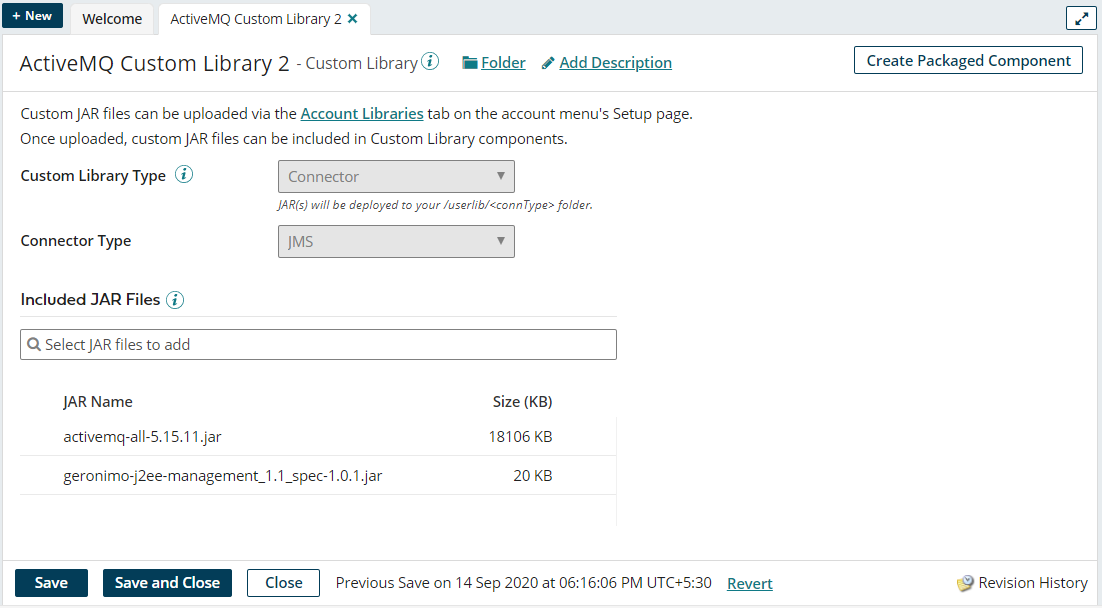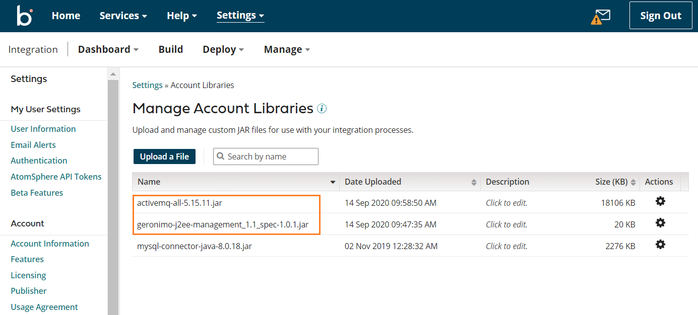 JMS libraries must be placed in the Boomi platform Account Libraries, these libraries are shipped with the JMS provider. Required libraries (JAR files) are in the ActiveMQ installation folder (activemq-all-5.15.12.jar, geronimo-j2ee-management_1.1_spec-1.0.1.jar).