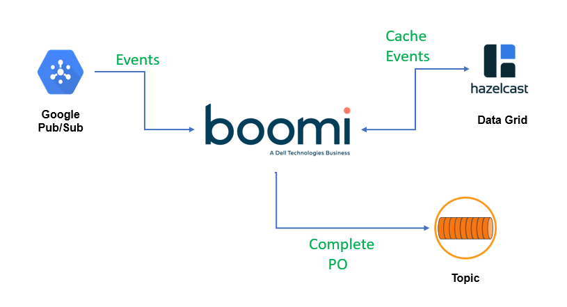 Boomi Platform provides Google Cloud Pub/Sub Connector to receive and send messages with PUBLISH/PULL/ACKNOWLEDGE operations. Boomi sends all messages to Data Grid via a REST API call and later publishes a complete Purchase Order into JMS with the same order sequence as they originated from the source. Here Resequencing of messages is based on PO ID and SEQUENCE ID of each line item of an event.