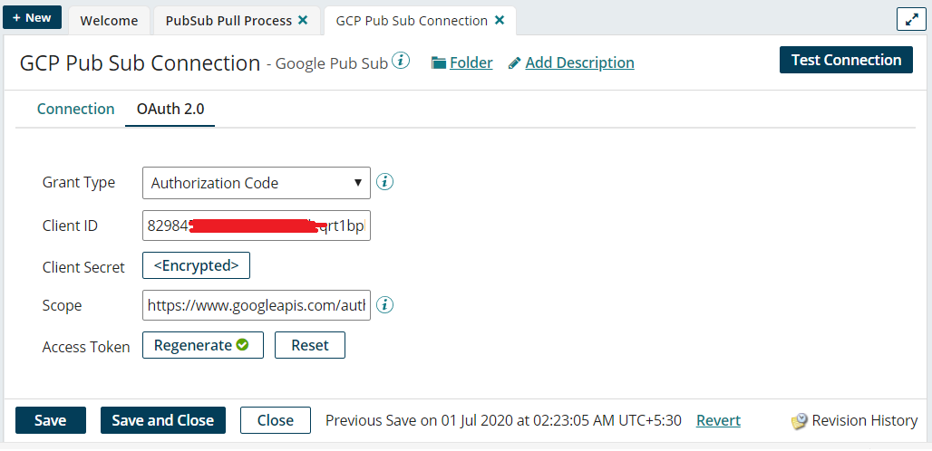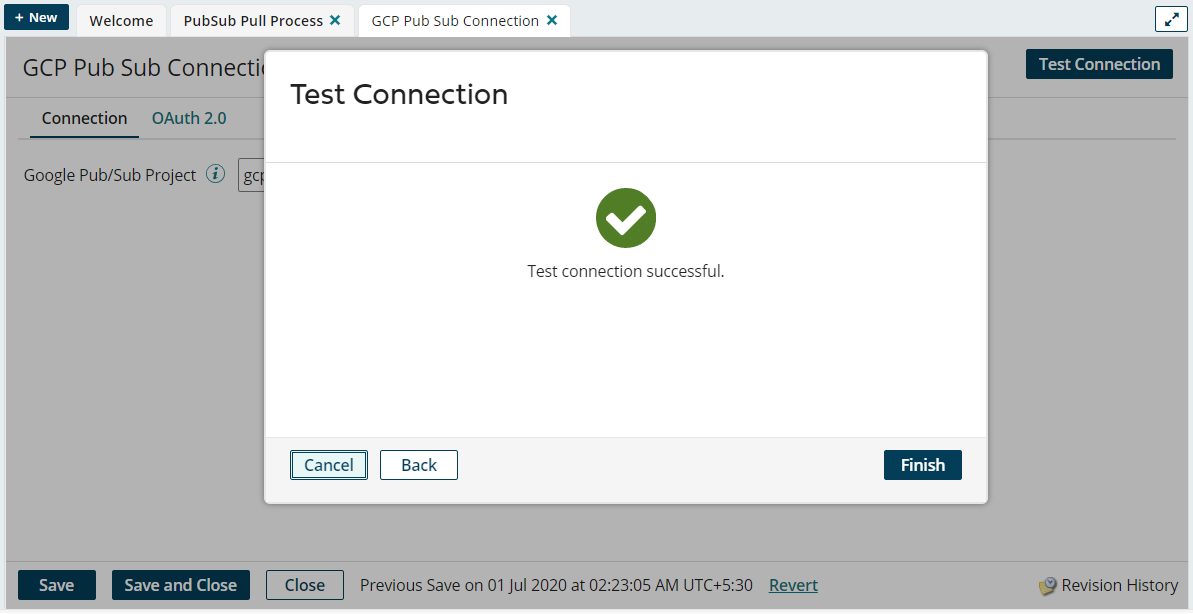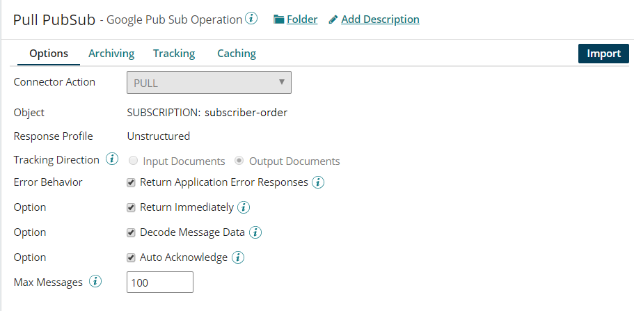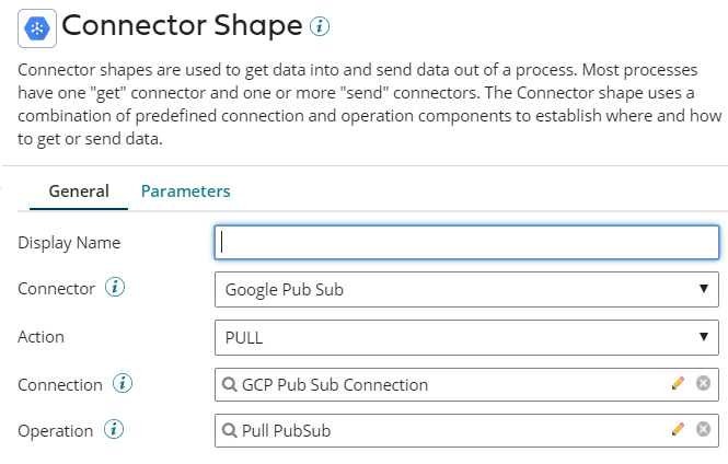 Create a new process in Boomi Platform and add a Connector Shape, choose Google Pub/Sub as Connector Type, PULL as Action Type, then create Connection and Operation as follows: