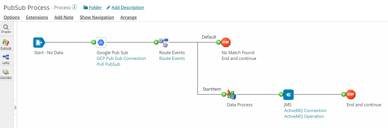 A Boomi Process represents a business process or transaction-level interface between two endpoints/systems that may contain a series of shapes connected to illustrate the steps to transport, route, or manipulate data from source to destination. The structure and format of Boomi data are represented as Profile. Boomi supports a broad range of connectors, but in this use case, connectors that have been used are Google Cloud Pub/Sub, JMS, and HTTP for integration.