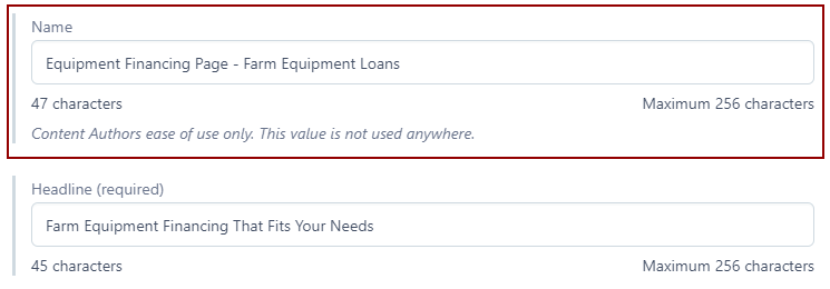Another common naming convention in XTIVIA projects is to prefix page specific content sections with the page title—for example, you might have a landing page called “Equipment Financing” and you might prefix all the page section names with “Equipment Financing Page” leading to “Equipment Financing Page – Farm Equipment Loans Hero”, “Equipment Financing Page – What We Can Finance CTA”, and so on.