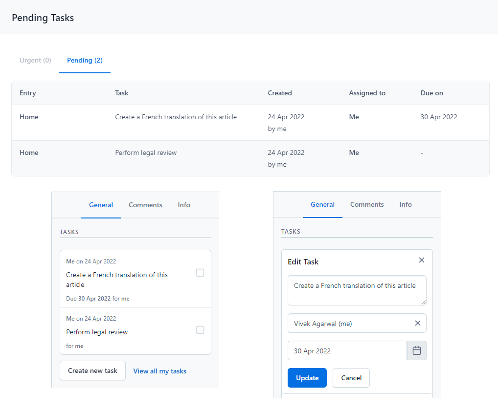 Leverage content entry tasks to organize your content team’s work and ensure that stuff doesn’t fall through the cracks. The Tasks app allows you to create, assign, and complete tasks on a content entry within the Contentful Web App (or Compose and Launch); tasks can be assigned to one or more members of the content team. An incomplete task will prevent the accidental publishing of the associated content entry. For example, you can create tasks for editorial or legal review, or tasks for translation into specific languages.