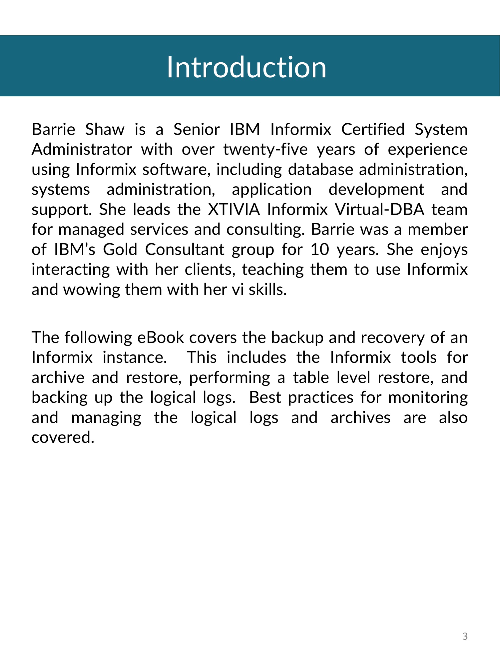 The following eBook covers the backup and recovery of an Informix instance. This includes the Informix tools for archive and restore, performing a table level restore, and backing up the logical logs. Best practices for monitoring and managing the logical logs and archives are also covered.