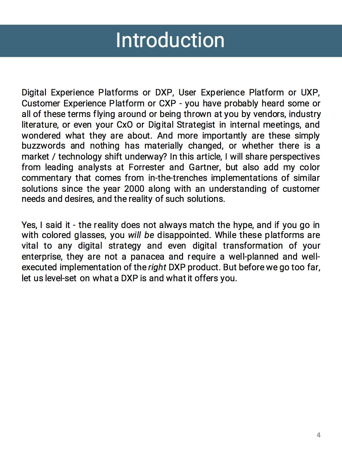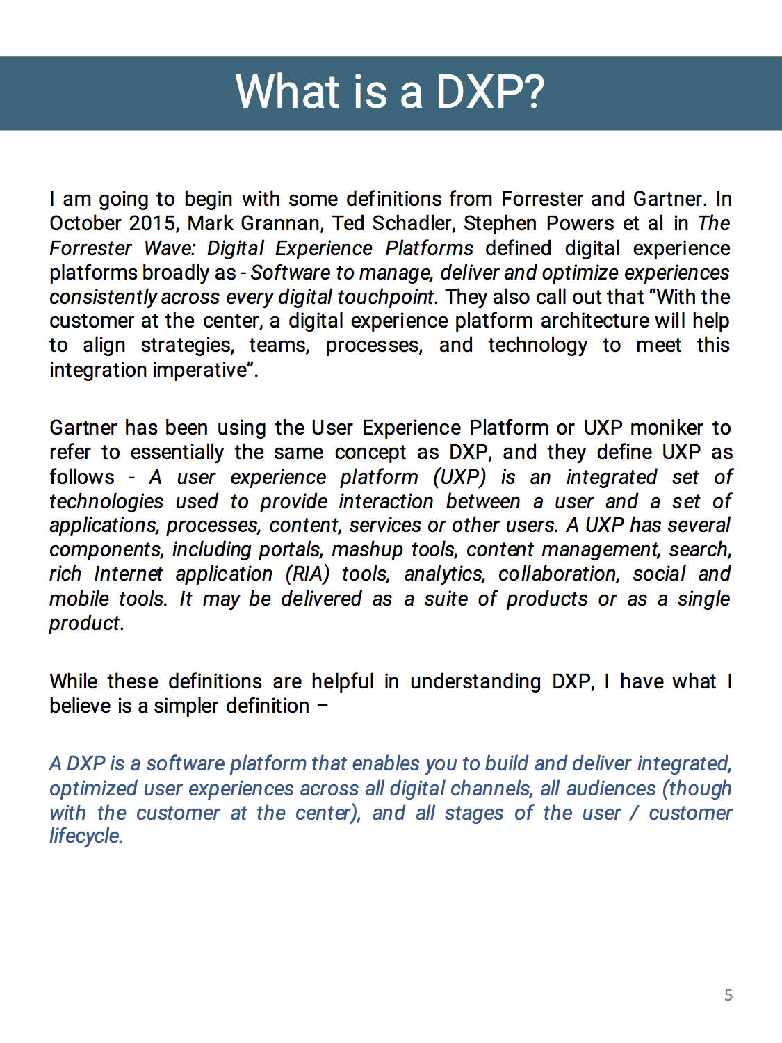 Digital Experience Platforms or DXP, User Experience Platform or UXP, Customer Experience Platform or CXP – you have probably heard some or all of these terms flying around or being thrown at you by vendors, industry literature, or even your CxO or Digital Strategist in internal meetings, and wondered what they are about. And more importantly, are these simply buzzwords and nothing has materially changed, or whether there is a market/technology shift underway? In this article, I will share perspectives from leading analysts at Forrester and Gartner, but also add my color commentary that comes from in-the-trenches implementations of similar solutions since the year 2000 along with an understanding of customer needs and desires, and the reality of such solutions.