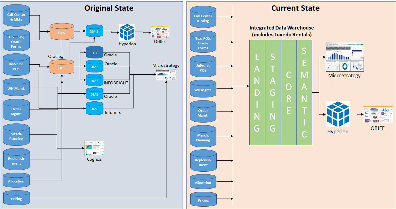 A study was conducted with input from various stakeholders, with the key outcome being the consolidation of all data marts into a single Integrated Data Warehouse (IDW) based on the Teradata platform. Tuxedo Sales and Rentals, a significant business unit, had its own data mart, which needed to be migrated to the Teradata-based Integrated Data Warehouse (IDW).