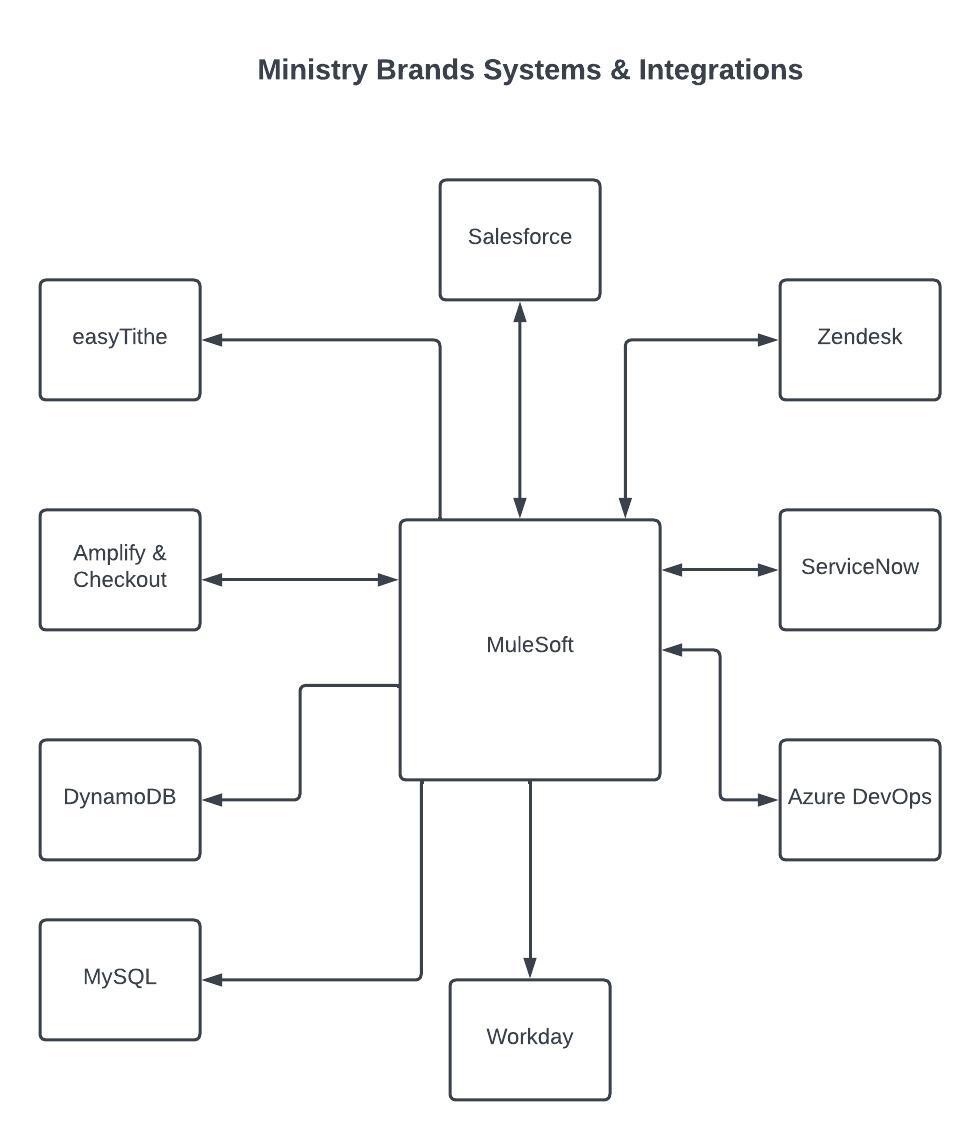 Following a series of acquisitions, our client faced the challenge of integrating a diverse ecosystem of systems and applications. With multiple brands and platforms in place, they needed a seamless, scalable integration solution to synchronize Accounts, Contacts, and other key data across various systems. The integration also had to support complex workflows and a self-service checkout portal for church products, while ensuring compatibility with Salesforce, Workday, and Zendesk.