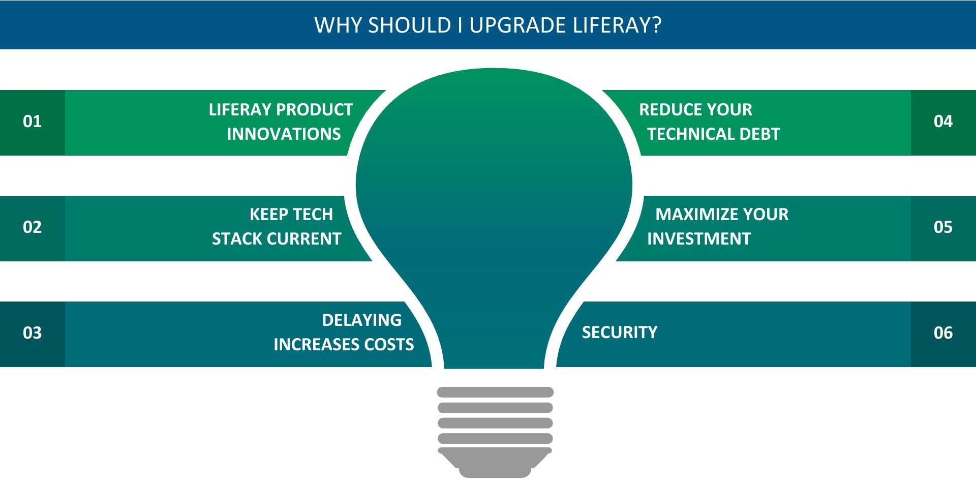 Putting off Liferay upgrades can have a negative impact on your business. You can expect to see many tangible and intangible side effects that impact your ability to effectively leverage the platform for all its potential. In some scenarios where Liferay upgrades have been put off for too long, you may find yourself undergoing a major effort to upgrade your infrastructure up to the latest version of Liferay while incurring some significant costs to do so.